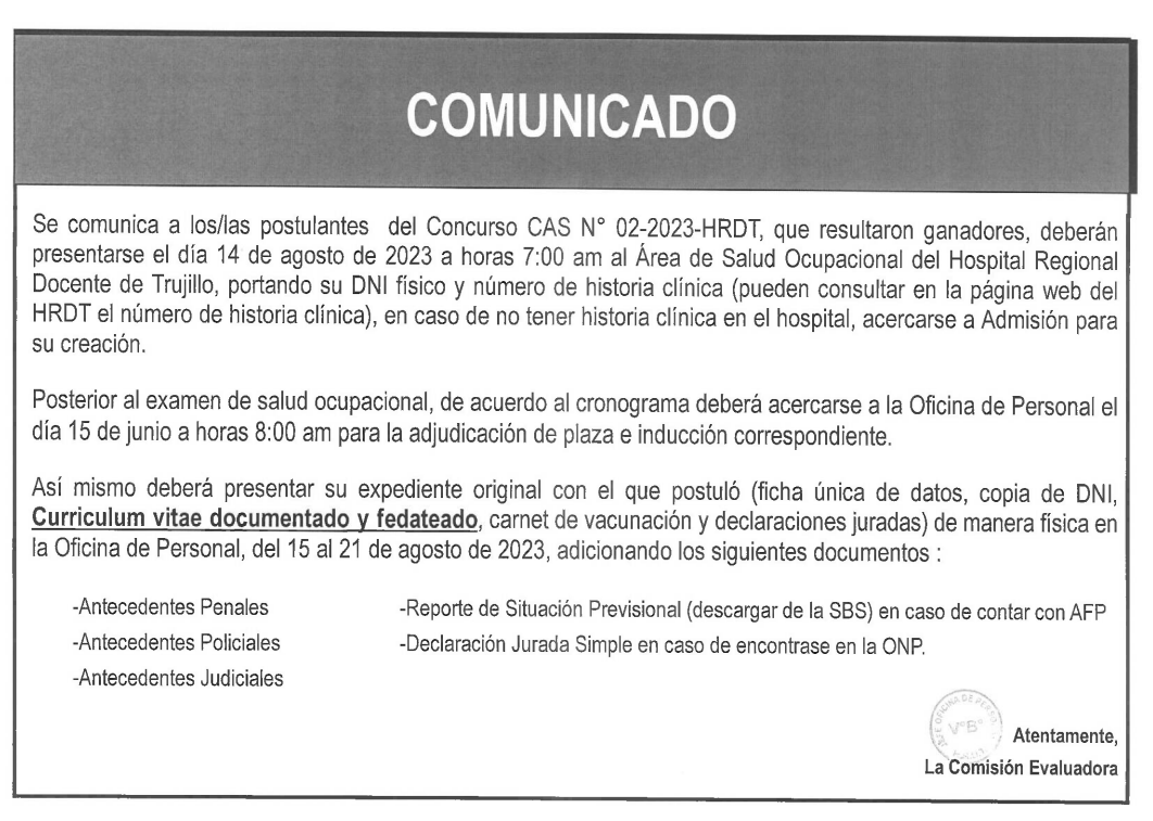 EL PLAZO MÁXIMO DE RECEPCIÓN DE LOS EXPEDIENTES (C.V y ANEXOS) ES EN (P.D.F) HASTA EL JUEVES 15 DE JUNIO HASTA 09:00pm, REMITIR LAS OFERTAS AL CORREO ELECTRÓNICO: Esta dirección de correo electrónico está siendo protegida contra los robots de spam. Necesita tener JavaScript habilitado para poder verlo., EN EL ASUNTO DEL CORREO DEBERÁN INDICAR A QUE PUESTO POSTULAN + NOMBRES Y APELLIDOS (OBLIGATORIO).