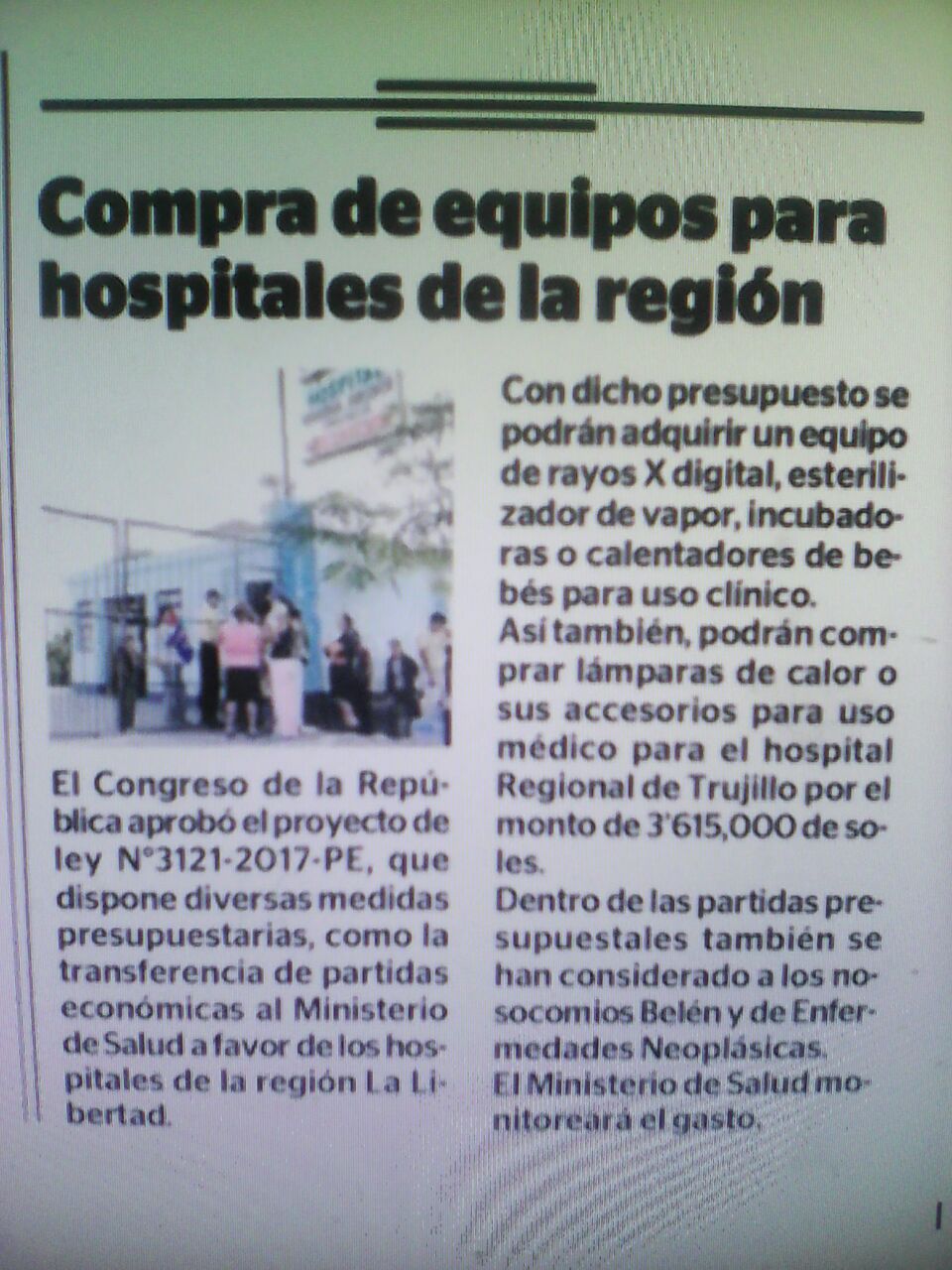Congreso de la República anuncia la compra de accesorios médicos Según la nota informativa, el Congreso de la República señala la compra de accesorios médicos a favor del Hospital Regional Docente de Trujillo. A través de las transferencias económicas también se realizarán a otros dos centros de salud de la Región La Libertad.